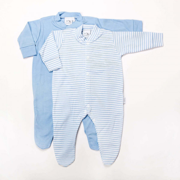Pair of Blue cotton sleepsuits, one blue & one blue/white Stripe Age: New Born Size Guide: Up to 4.5kg (9.9lbs) Washing Instructions: Machine Washable Material: 100% Cotton.
